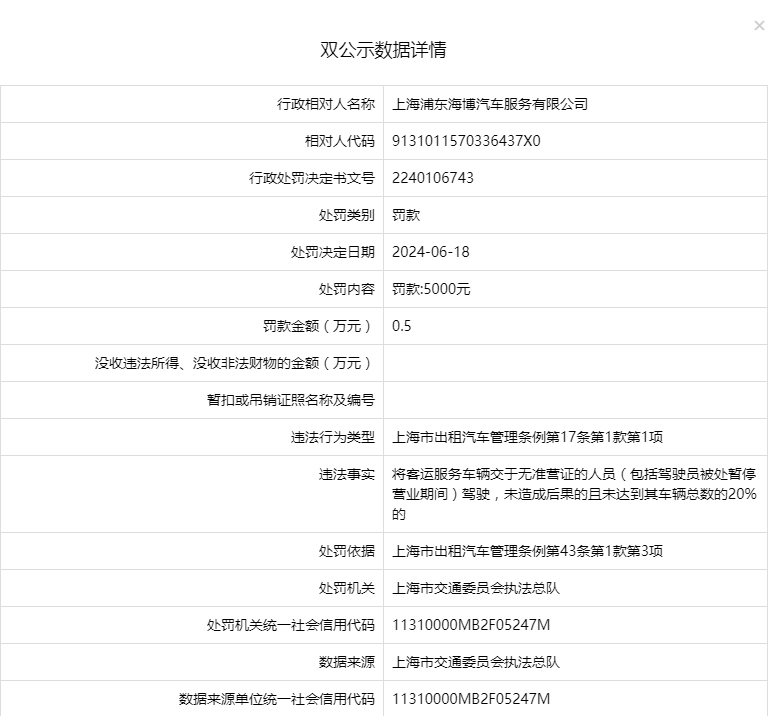 消息,近日,上海浦东海博汽车服务有限公司因将客运服务车辆交于无准营证的人员驾驶,未造成后果的且未达到其车辆总数的20%的,被上海市交通委员会执法总队罚款5000元。